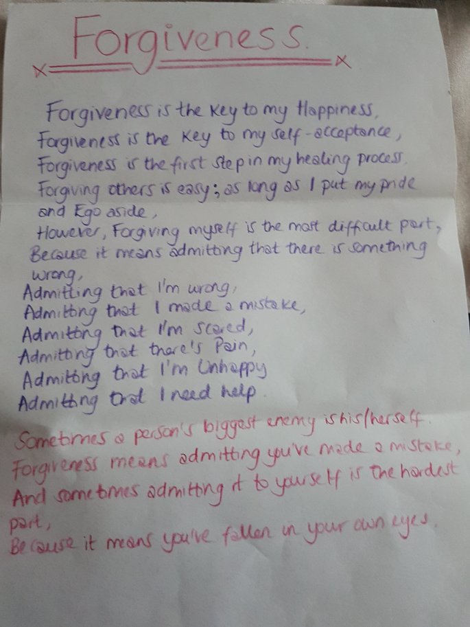 However, forgiving myself is the most difficult part, because it means admitting that there is something wrong. Admitting that I’m wrong. Admitting that I made a mistake. Admitting that I’m scared. Admitting that there’s pain. Admitting that I’m unhappy. Admitting that I need help.